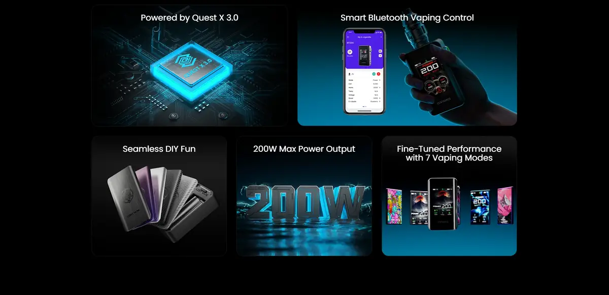 Sada Centaurus BT200 Box Kit ponúka inteligentné ovládanie cez Bluetooth , ktoré vám umožňuje spravovať a prispôsobovať si vapovací zážitok priamo z mobilného zariadenia pomocou aplikácie. Vďaka čipu QUEST X 3.0 získate okamžitú odozvu, pokročilú ochranu a presné nastavenia.